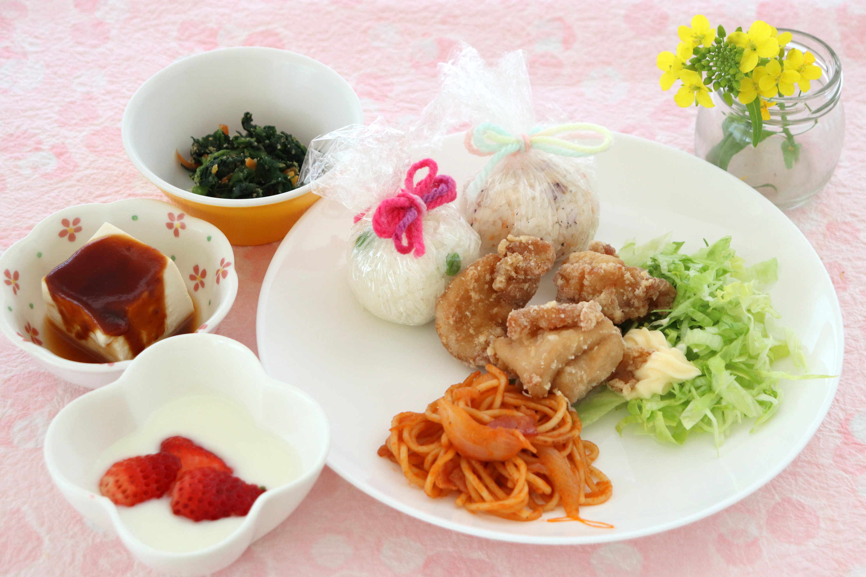 ・満開おにぎり・鶏のから揚げ・ほうれん草のごま和え・温奴豆腐/甘みそたれ・お吸い物・ヨーグルト/イチゴ