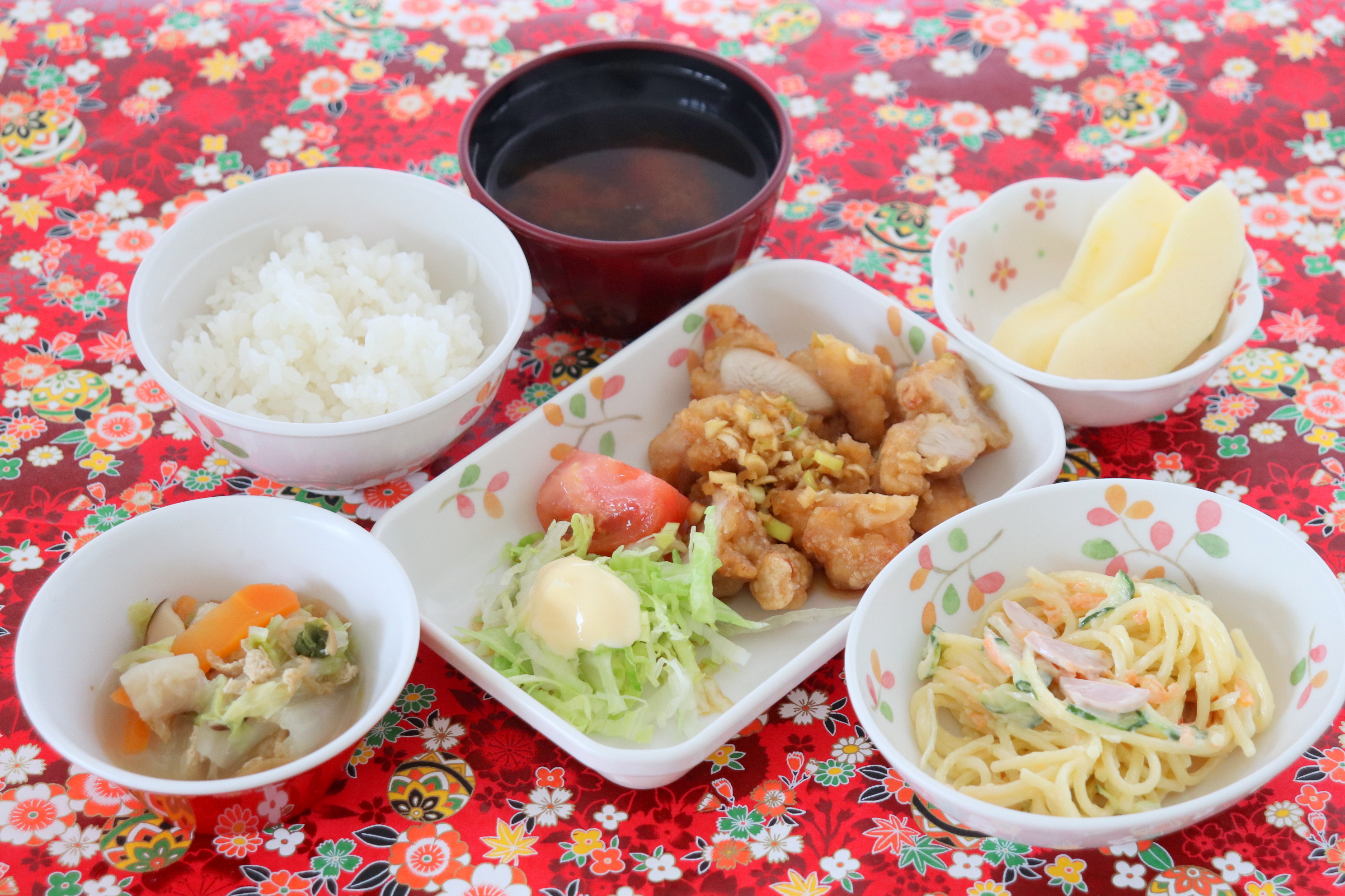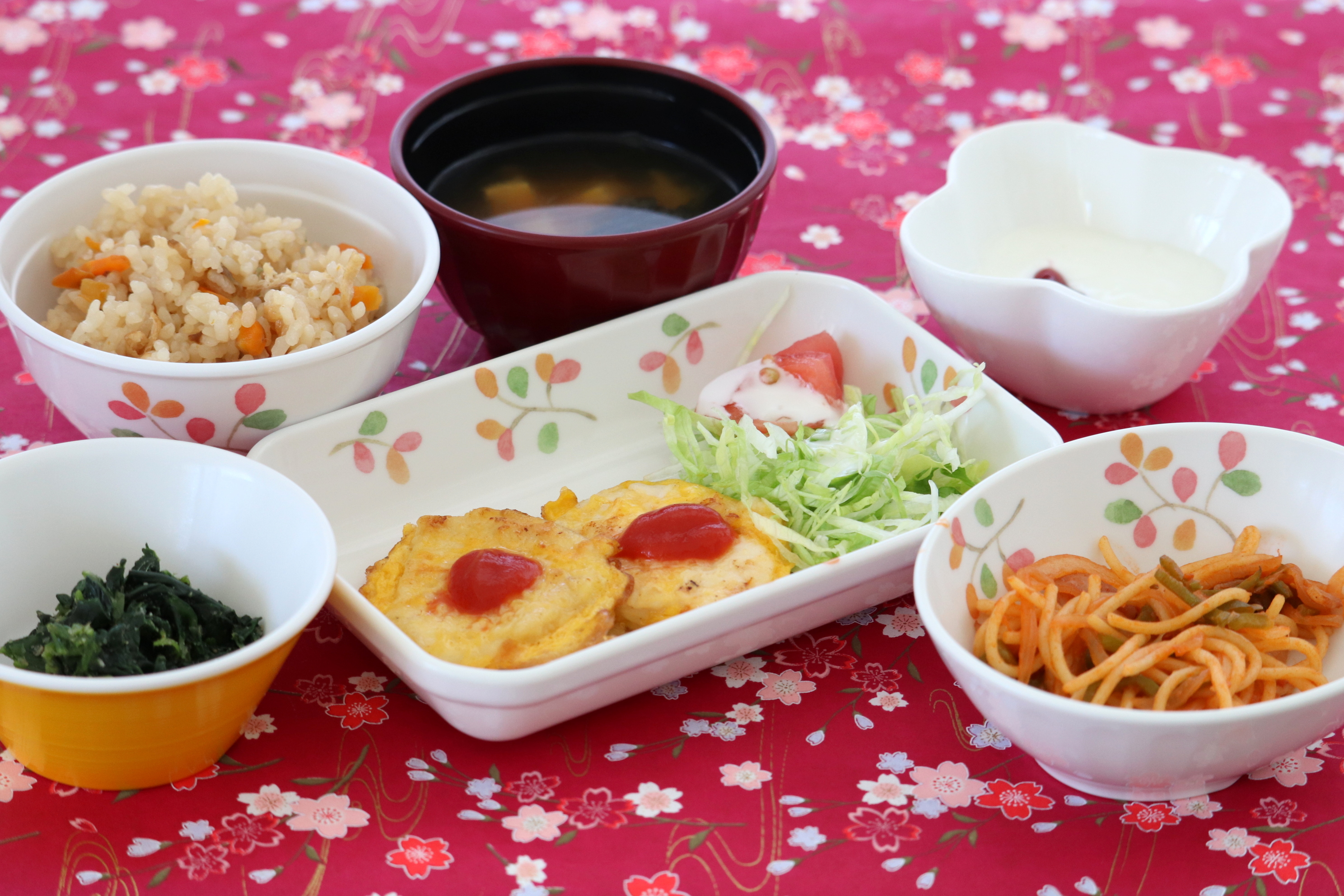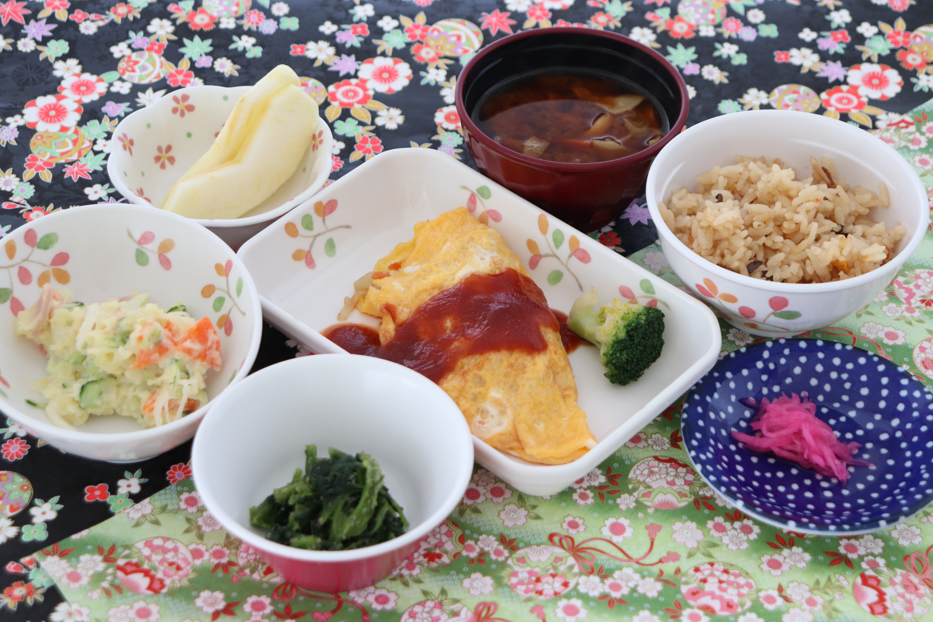 五目炊き込みご飯、オムレツ、ほうれん草のごま和え、ポテトサラダ、みそ汁、りんご