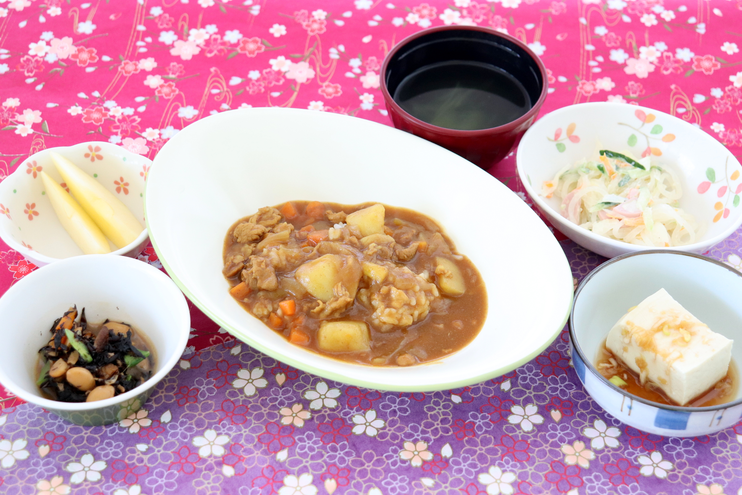 ・カレーライス・冷ややっこ・ひじきの五目煮豆・春雨サラダ・お吸い物・バナナ