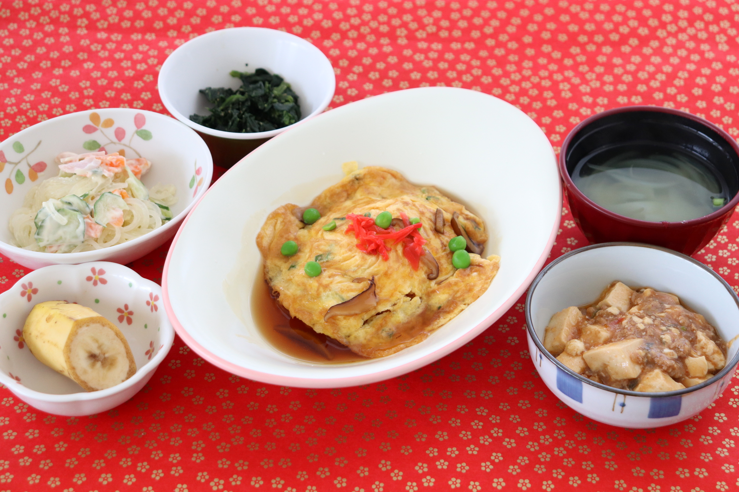・天津飯・麻婆豆腐・ほうれん草のごま和え・春雨サラダ・わかめスープ・バナナ