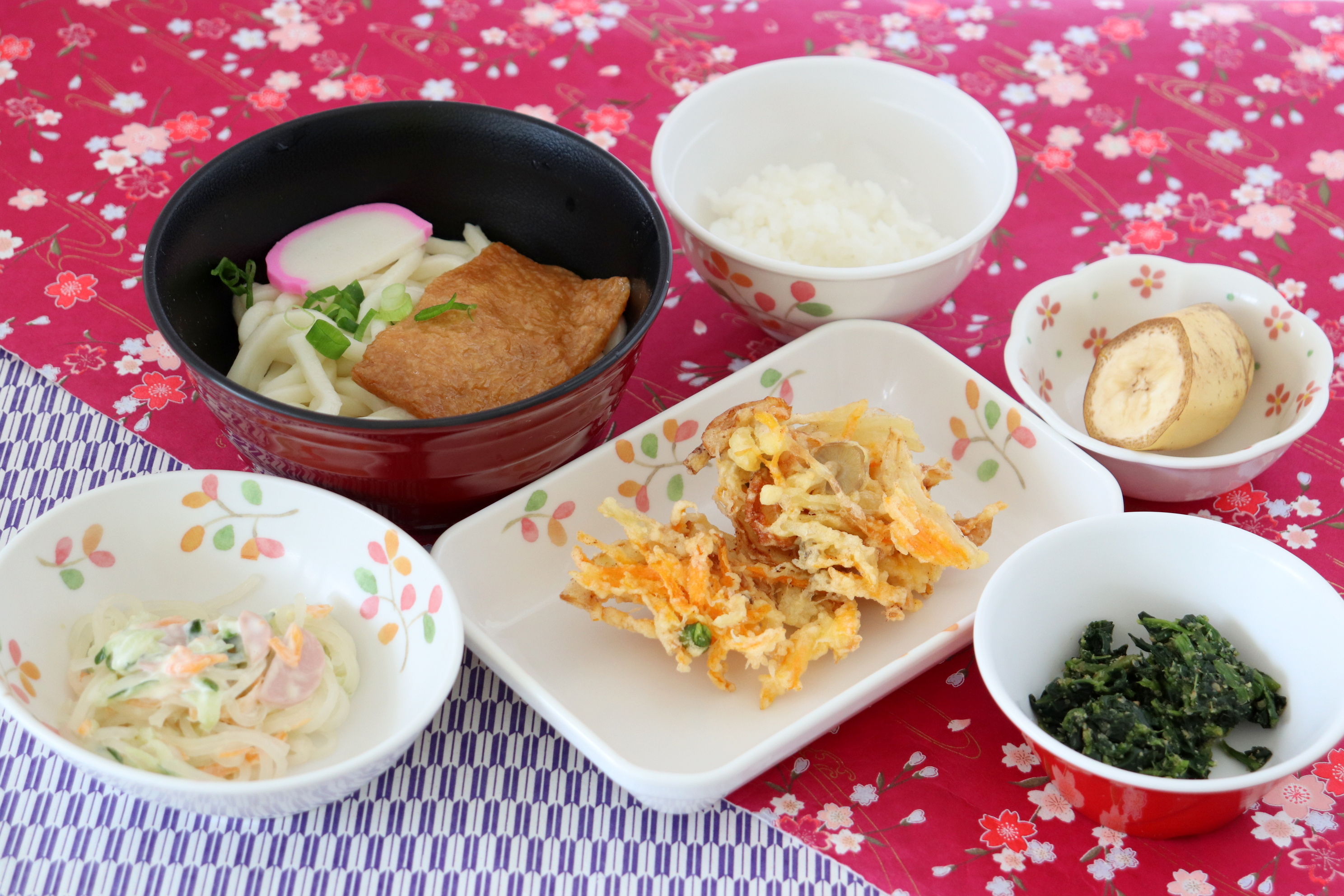 ・きつねうどん・小ライス・野菜のかき揚げ天ぷら・ほうれん草のごま和え・バナナ