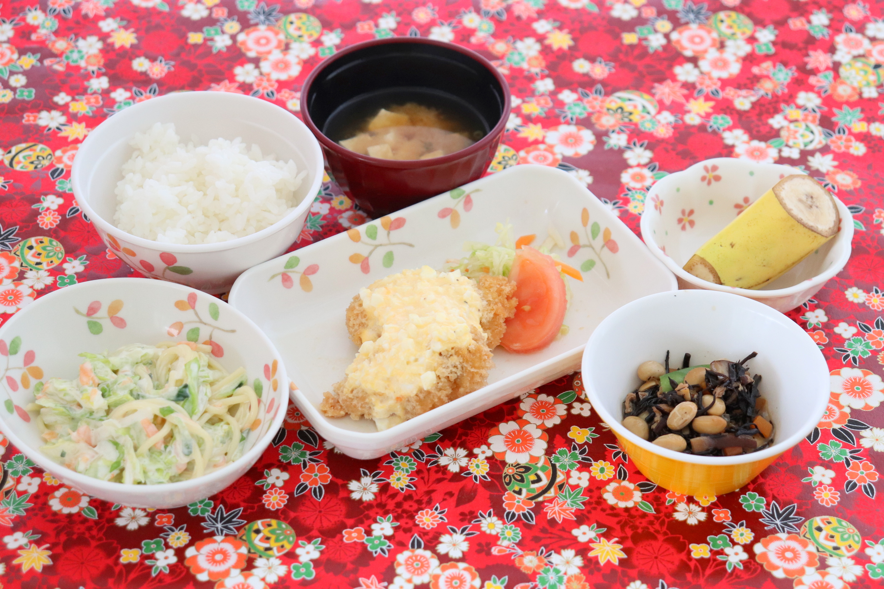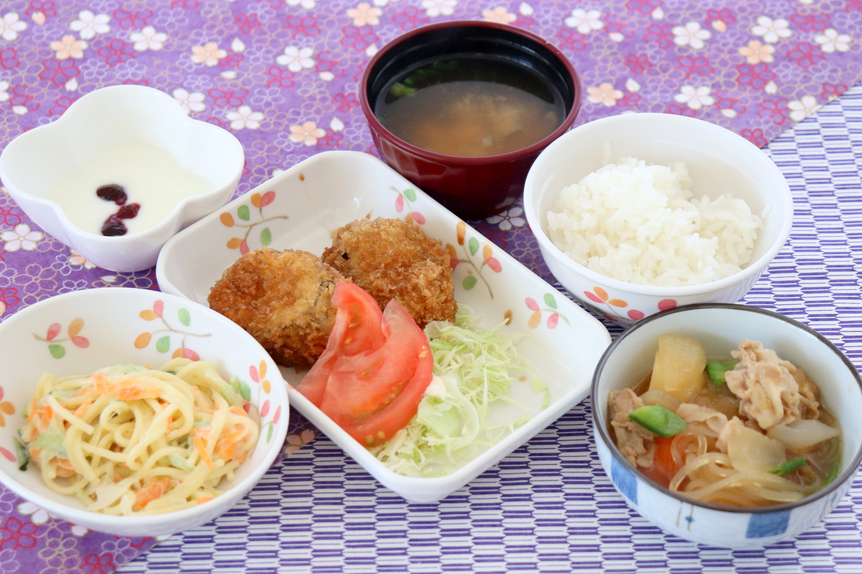 ・ナスのはさみ揚げ・肉じゃが・スパゲティサラダ・みそ汁・ヨーグルト/ジャム