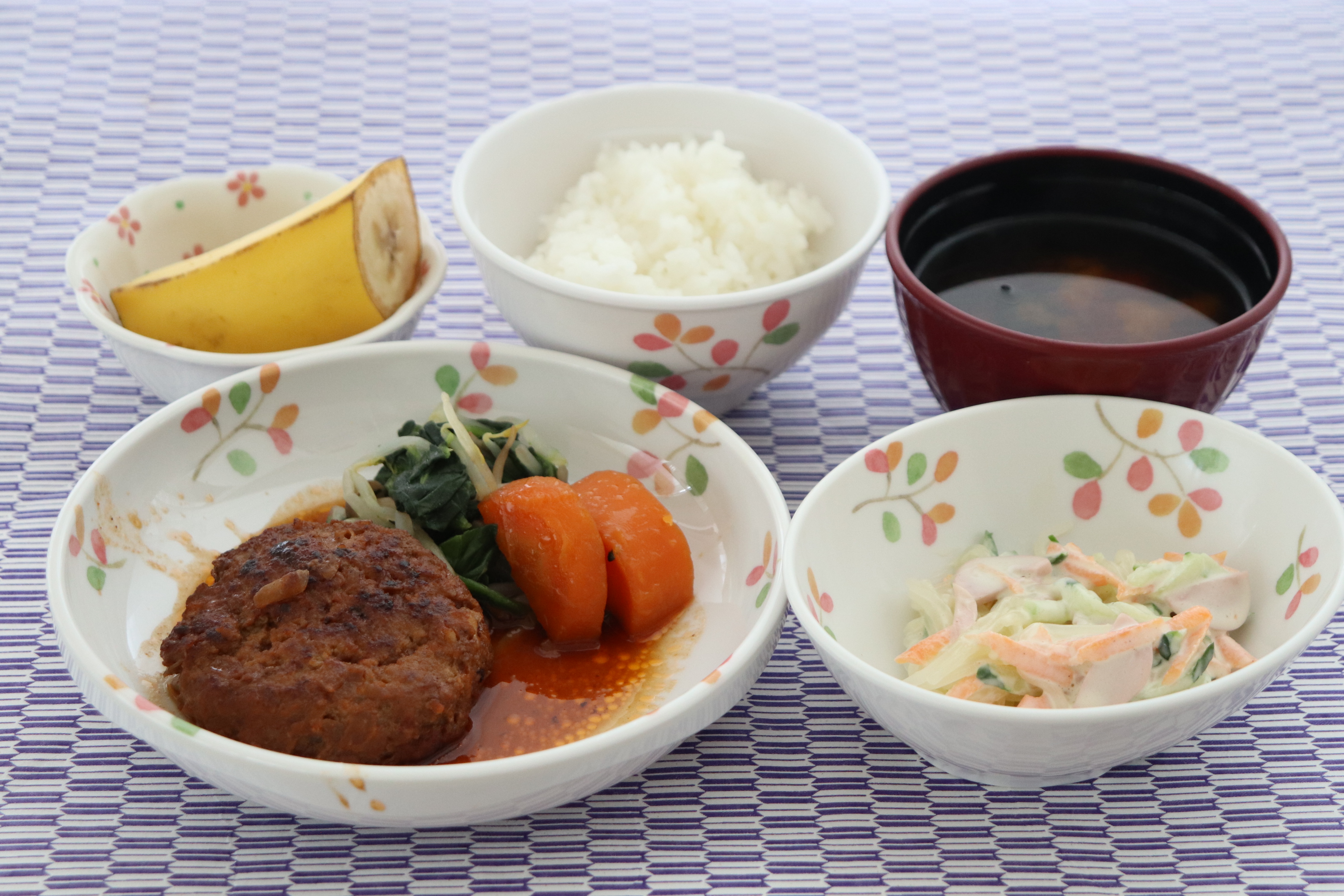 ・ハンバーグ/人参グラッセ・ほうれん草・春雨サラダ・みそ汁・バナナ