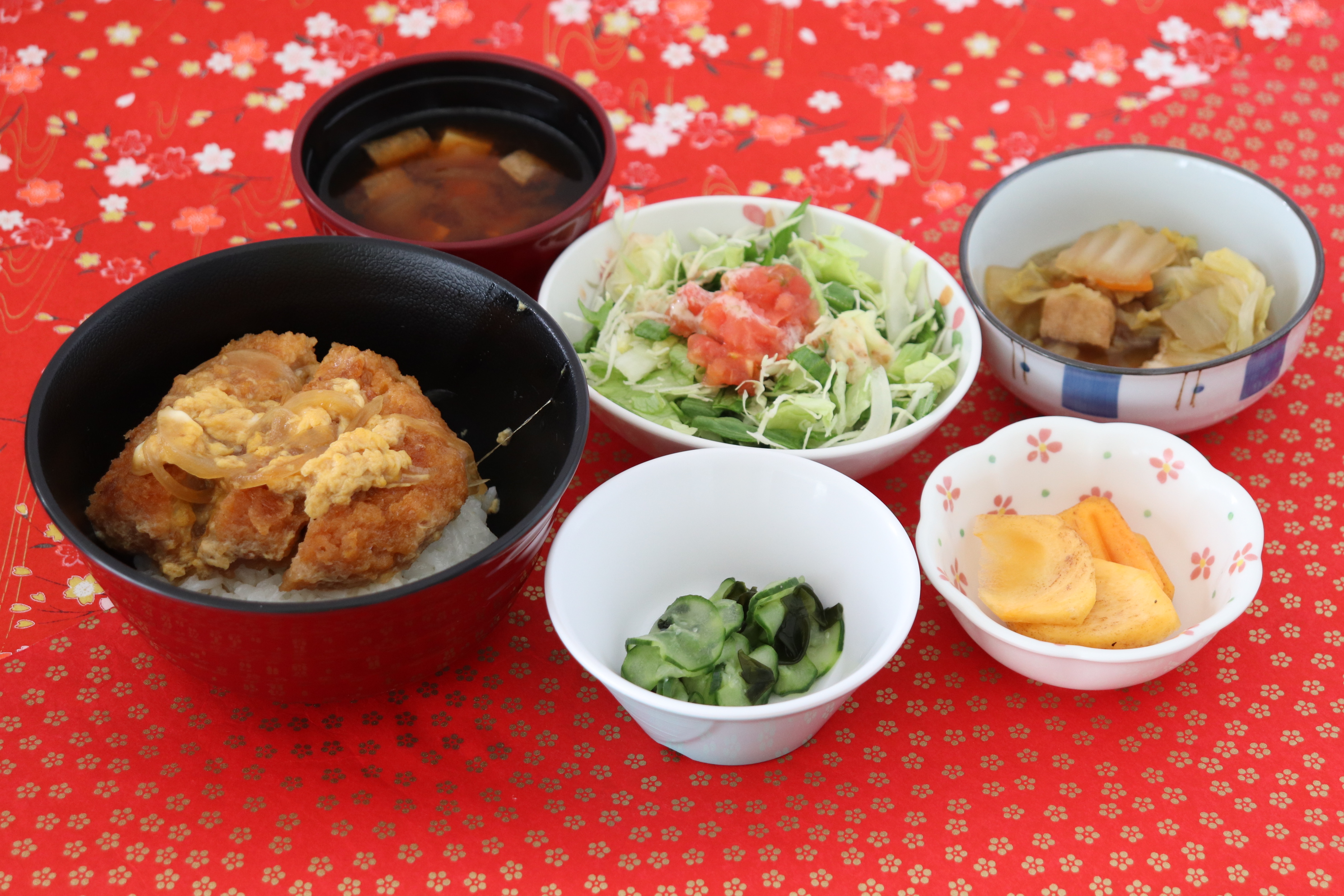 かつ丼、白菜と厚揚げの煮物、きゅうりとワカメの酢の物、グリーンサラダ、みそ汁、柿