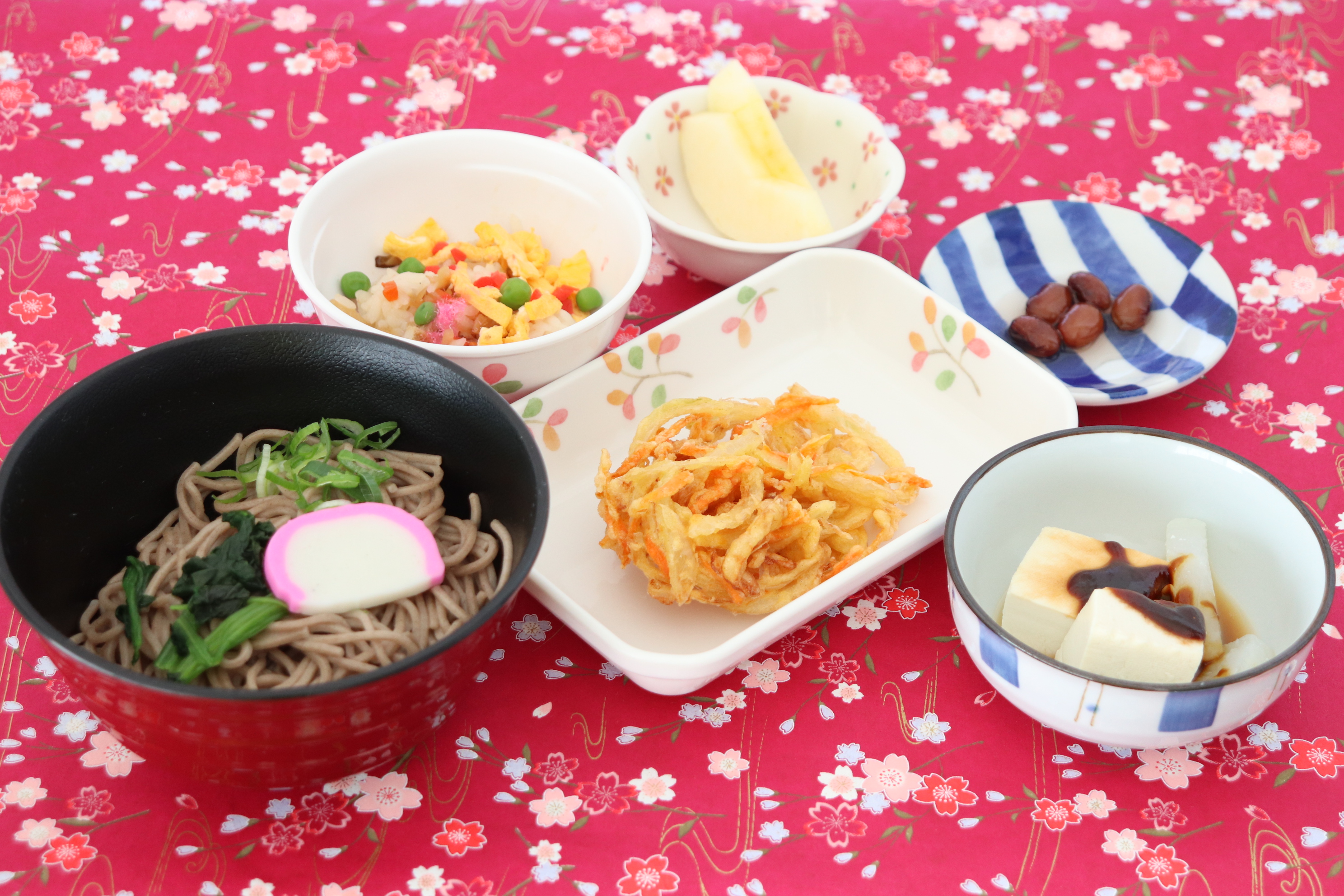 年越しそば、チラシ寿司、豆かき揚げ天ぷら、みそ田楽、金時豆、りんご