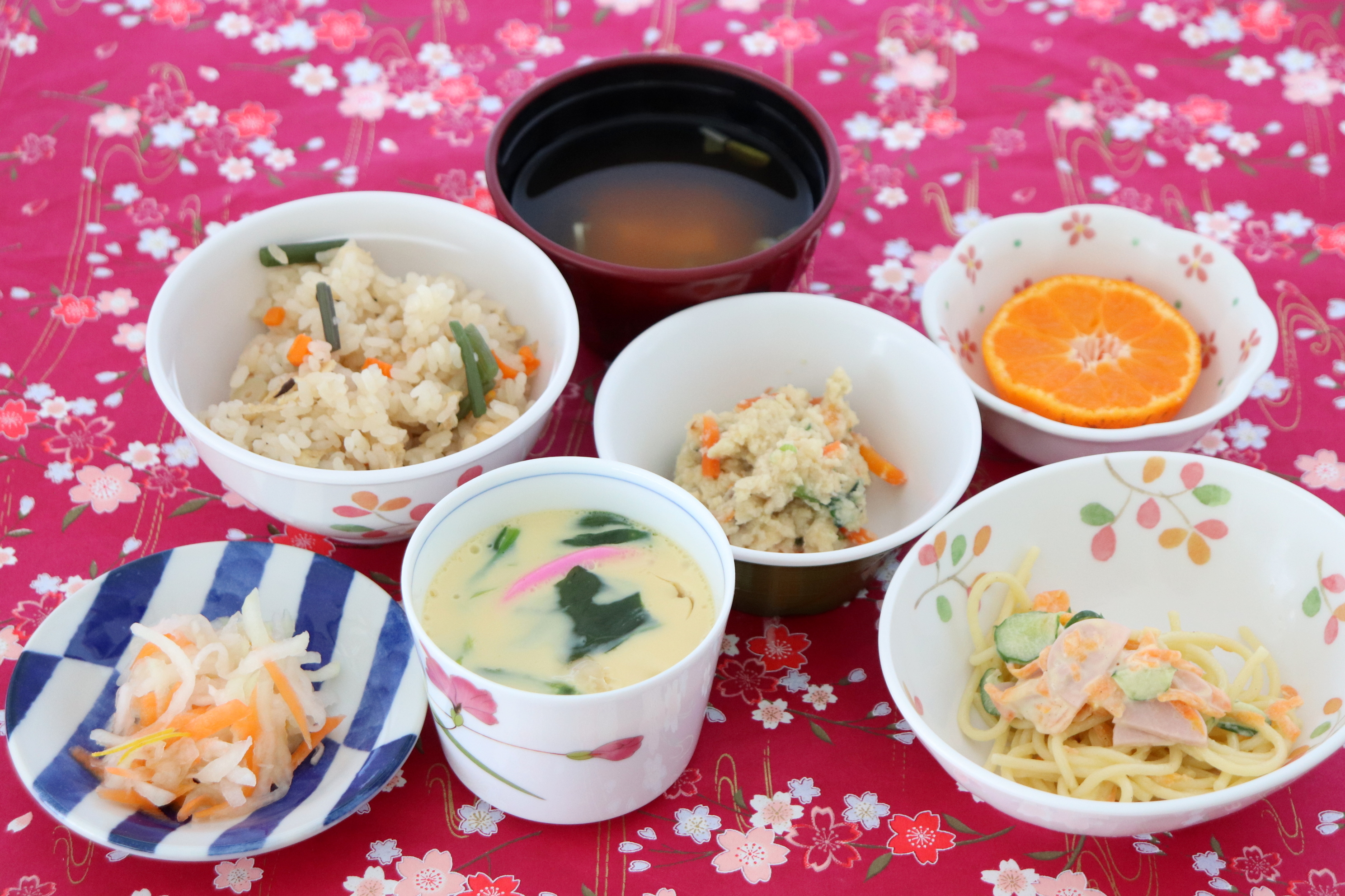 山菜おこわ、茶碗蒸し、おからの煮物、スパゲティサラダ、大根のなます、みそ汁、みかん