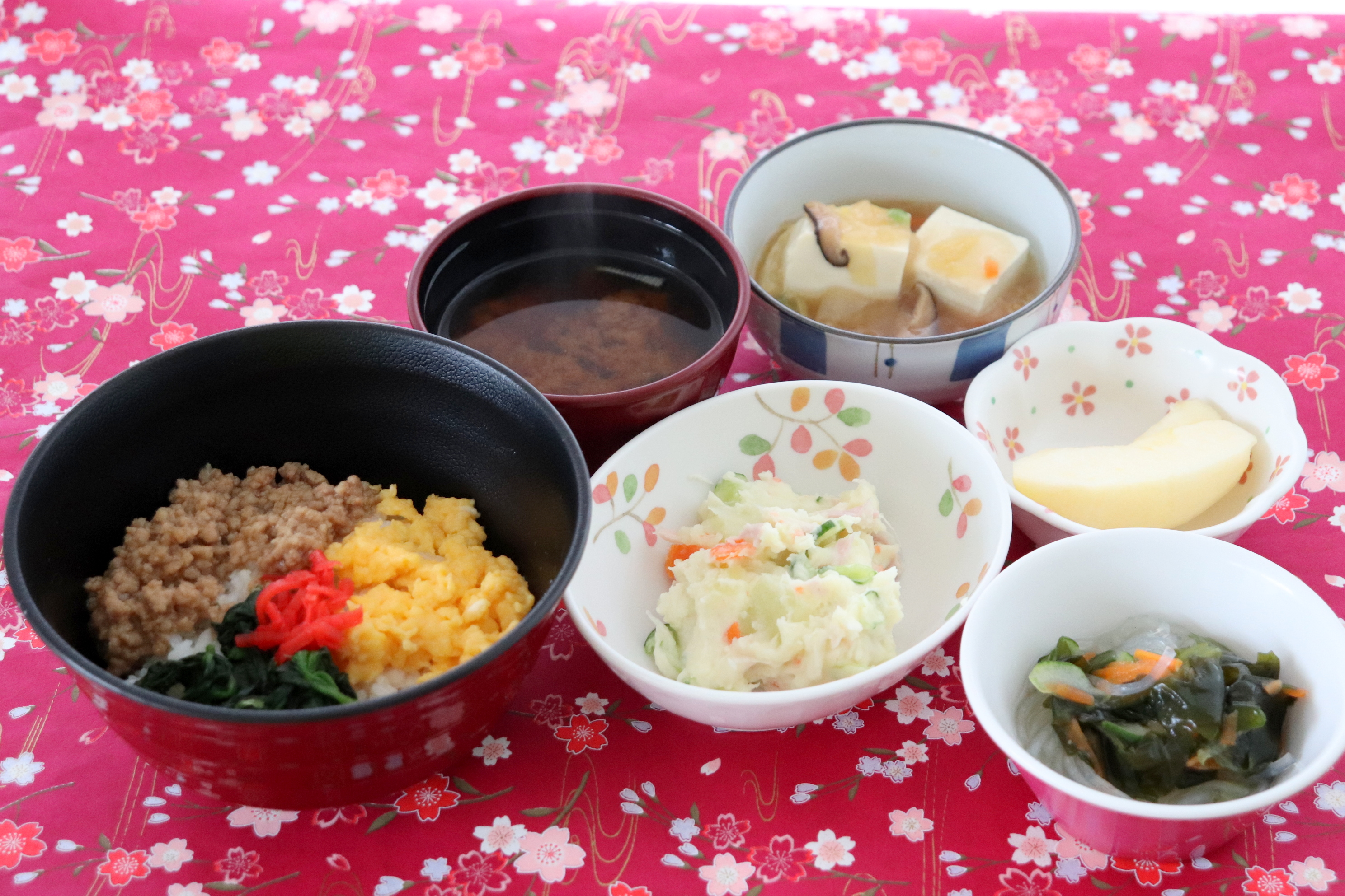 三色丼、あんかけ豆腐、春雨の酢の物、ポテトサラダ、みそ汁、りんご