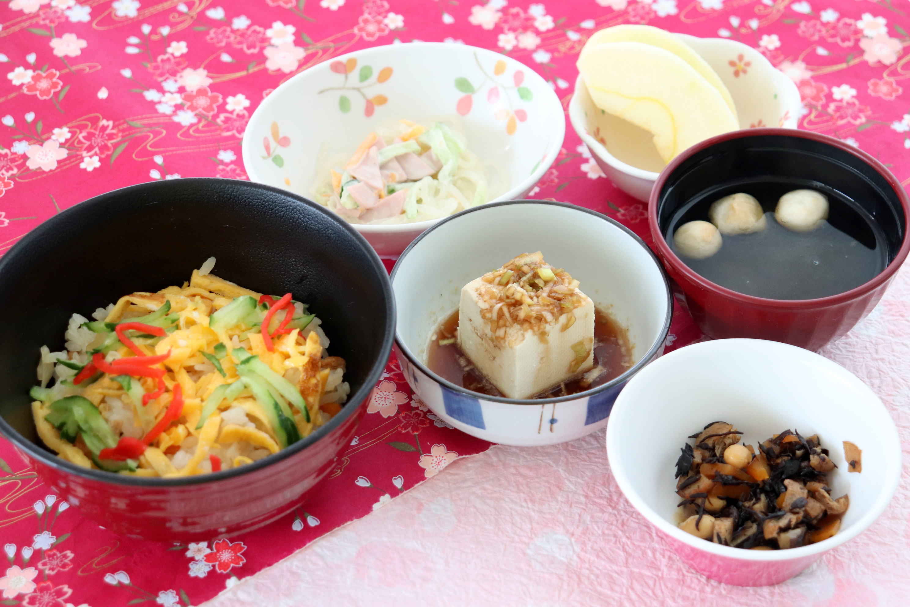 五目ちらし寿司、冷ややっこ、ひじきと大豆の煮物、サラダ、お吸い物、りんご