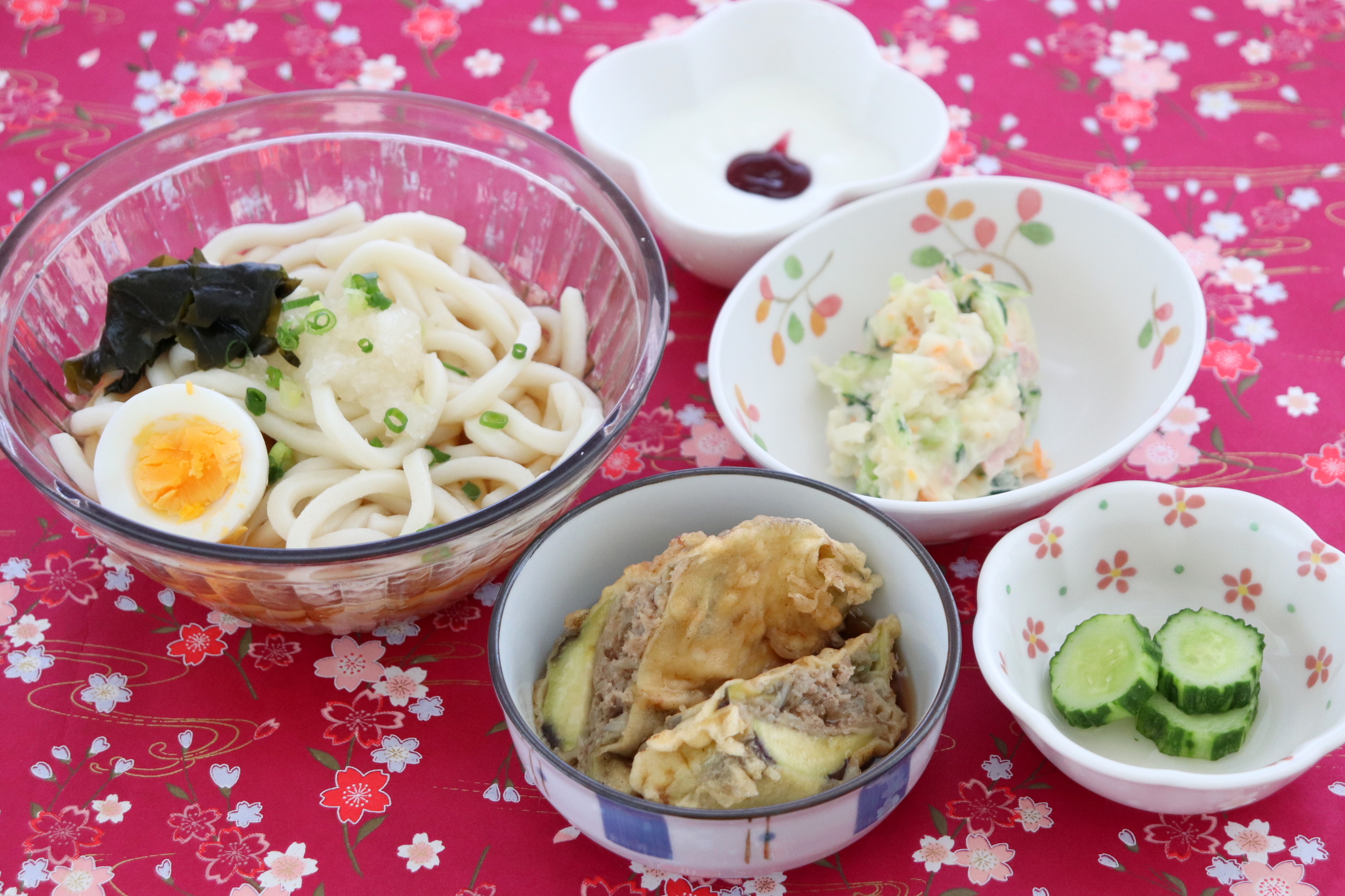 冷やしうどん、なすのはさみ揚げ、きゅうりの浅漬、ポテトサラダ、ヨーグルト/ジャム