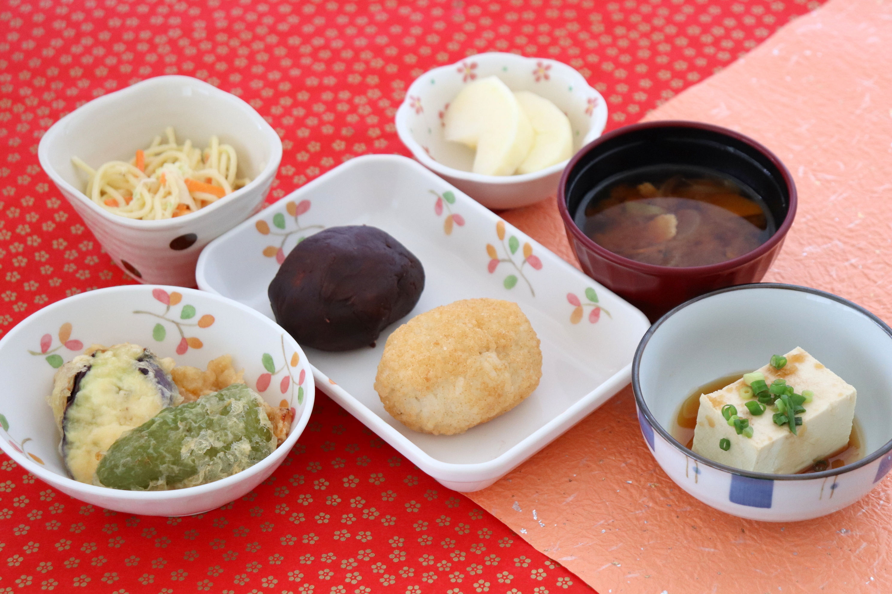 おはぎ、野菜の天ぷら、奴豆腐、スパゲティサラダ、みそ汁、りんご