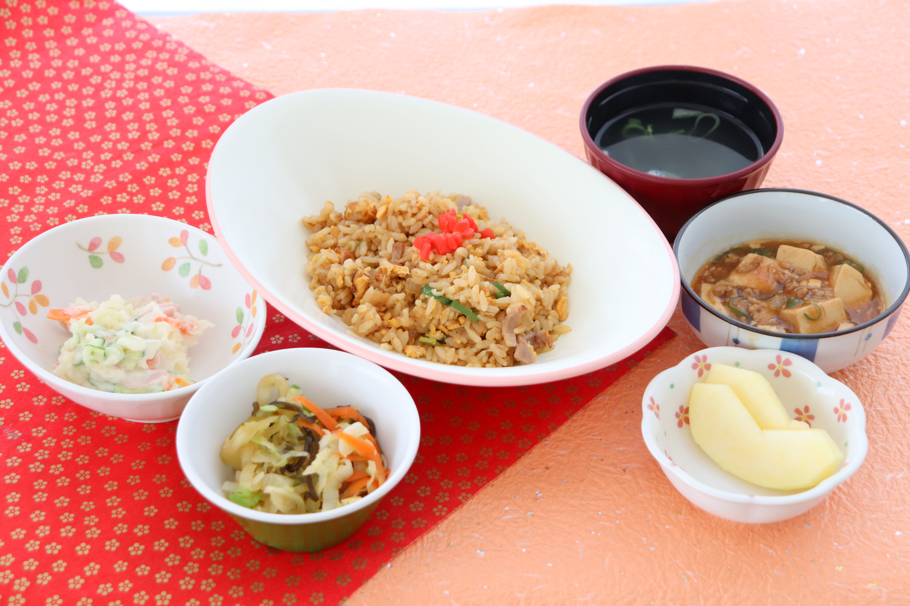 チャーハン、マーボ豆腐、塩昆布キャベツ、ポテトサラダ、中華スープ