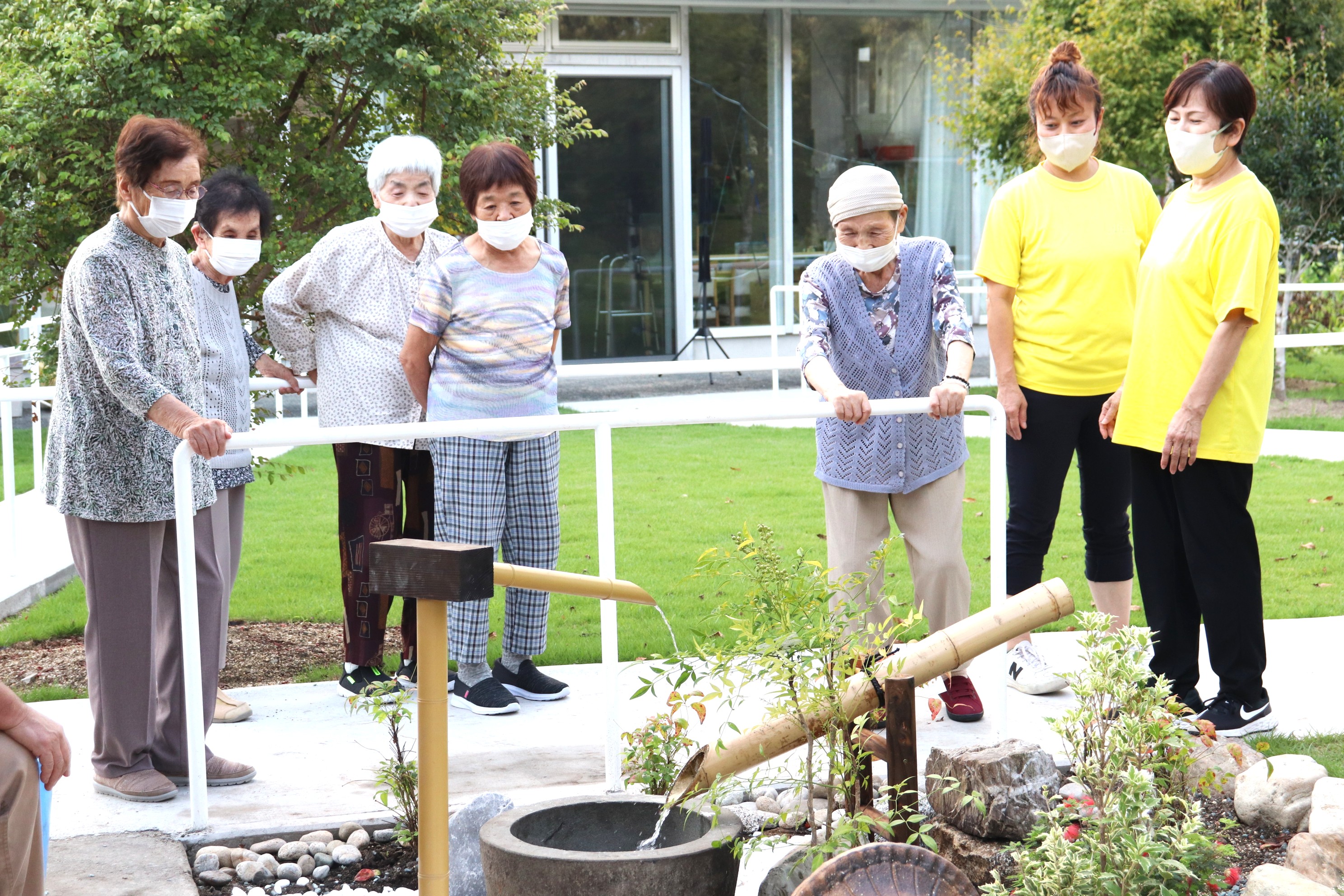 遊歩道の途中に設置された坪庭のししおどし
